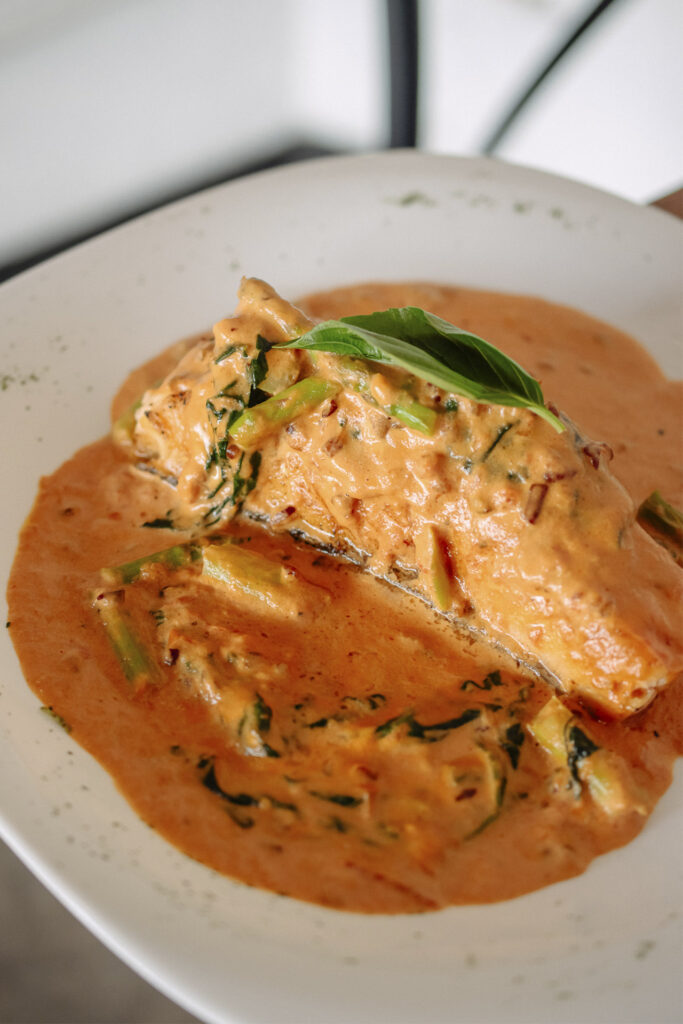 (Aprox 200g) $255.00Salmón con espinaca, espárrago, nuez, salsa rosada y chile.
