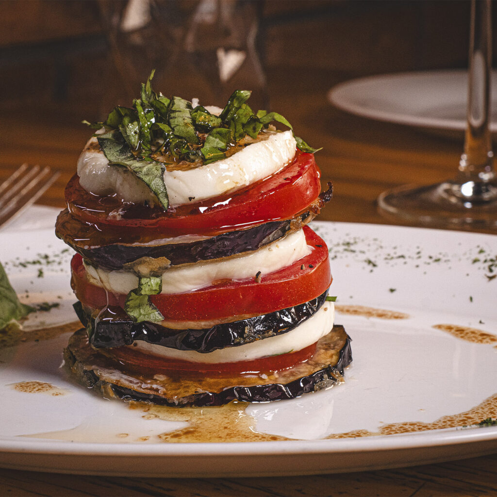 Rodajas de mozzarella fresca, jitomate y berenjena bañado con vinagreta.